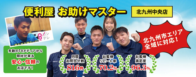 この度は便利屋お助けマスター北九州中央店にご来店いただきまして誠にありがとうございます。当社では「格安」を売りにしているわけでは無く、決して大手の便利屋さんでもありません。しかし、そんな中当社をお選びいただけたお客様には必ず「選んでよかった」 と言っていただけるサービスのご提供をお約束いたします。